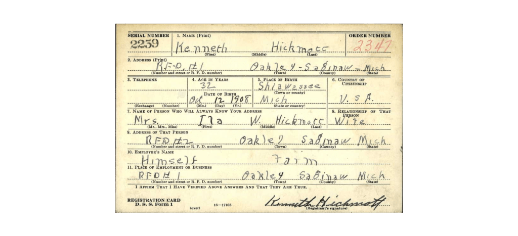 However, Kenneth’s birth date is questionable. I cannot find his birth certificate online. He claimed in several sources August 16, 1908 as his birth date (Social Security, and obituary). His World War II Draft Registration Card actually has October 12, 1908.