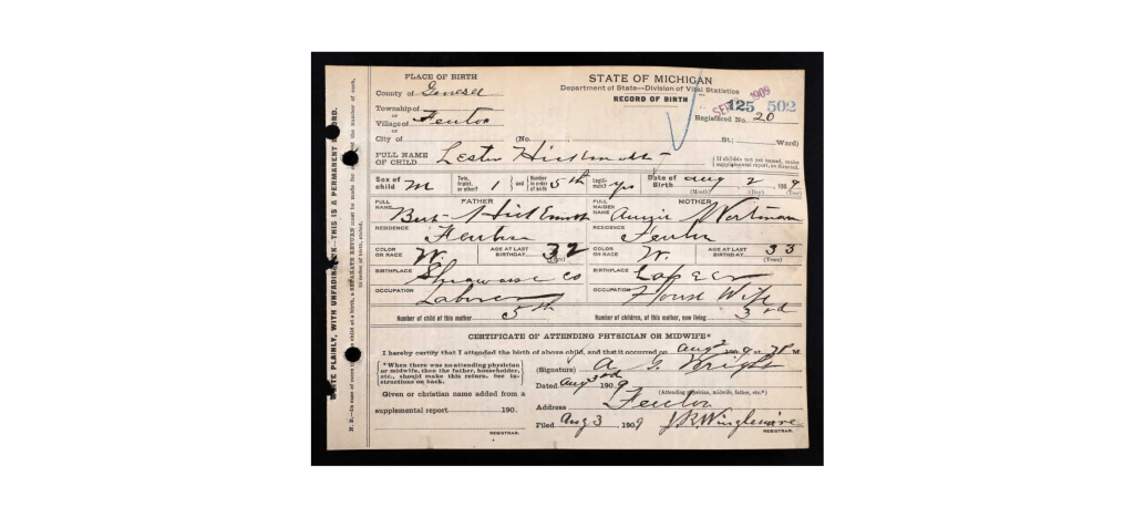 A while ago, I had discovered a birth certificate for Lester Hickmott – a son of Bert Hickmott and Anna Wortman (who are my great-grandparents). I had never heard of Lester before – but his birth certificate clearly makes him as part of the family – being the 5th child born, the 3rd living on August 2, 1909.