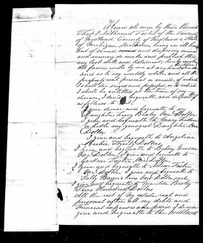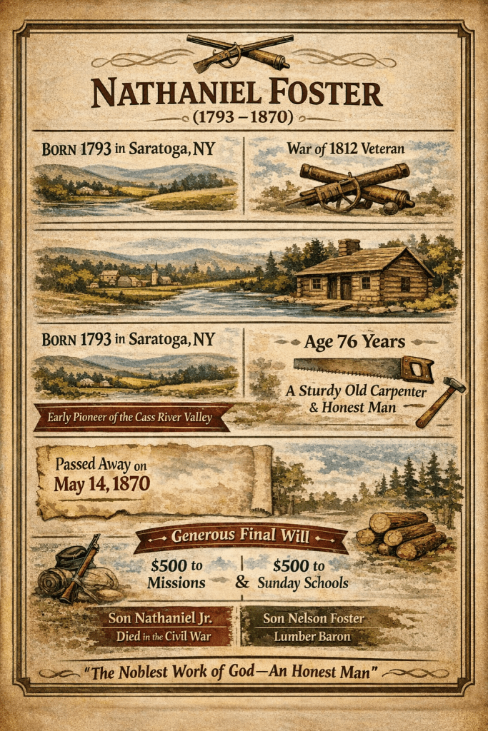 Nathaniel’s legacy lives on not just in his descendants, but in the land he helped settle and the stories he passed down. One of his sons, Nelson Foster, became a legendary lumberman in the Saginaw Valley — known for his strength, humor, and skill. Another son, Nathaniel Jr., died fighting for the Union in the Civil War, reportedly shouting “Give me liberty or give me death” as he fell.