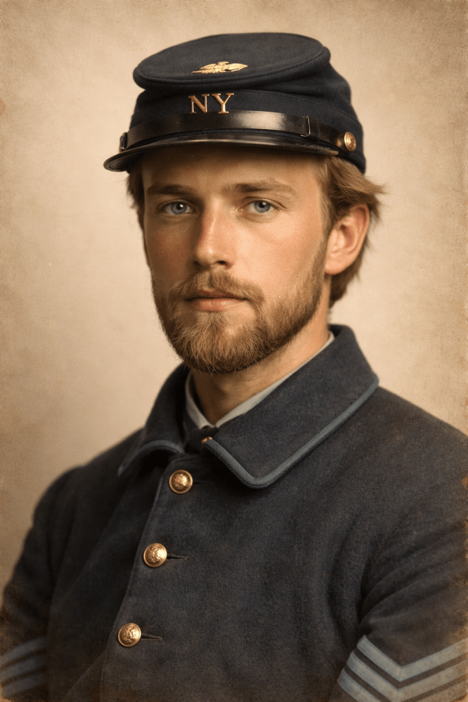 On 28 November 1855, Martin married Henrietta O’Dell (1838–1865) in Genesee County, Michigan.² By 1860, he was residing in Brownville, Jefferson County, New York, where he appeared in the federal census with his occupation listed as farmer.³ A military description recorded in August 1862 described him as having blue eyes, sandy hair, a light complexion, and a height of five feet eleven inches.⁴