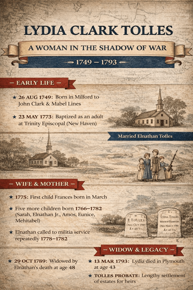 When the American Revolution is told through the lives of men, it becomes a story of enlistments, campaigns, and patriotism. When it is told through the lives of women, it becomes something very different: endurance, uncertainty, and survival. Lydia Clark Tolles, the wife of Elnathan Tolles, lived her entire adult life inside that second story.