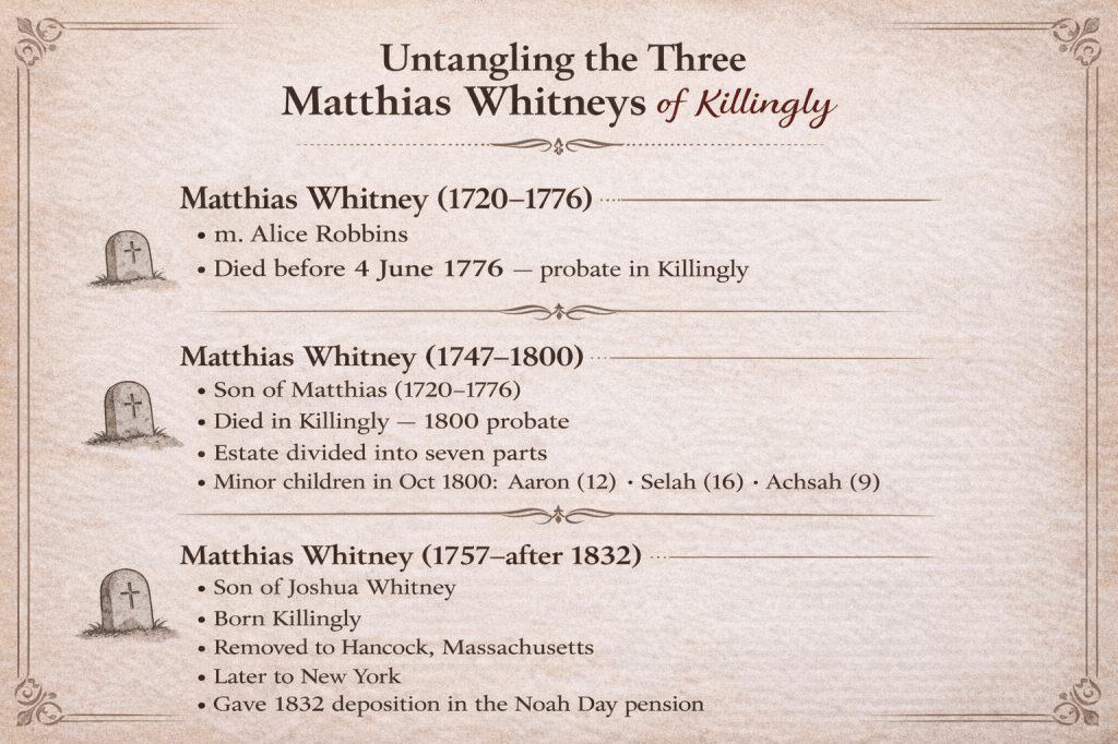The trail began with a brief entry in the American Genealogical-Biographical Index pointing to Revolutionary War rolls for a Matthias Whitney of Connecticut. At first it seemed possible that the record might belong to Matthias Whitney born in 1747, a known resident of Killingly. But once the probate files were examined, it became clear that the real issue was not whether “Matthias Whitney” had service — it was determining which Matthias the record described.