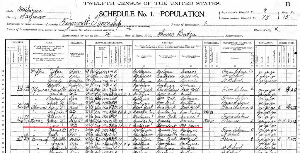 - 1900 U.S. census, Taymouth Township, Saginaw County, Michigan, John Rivers household.