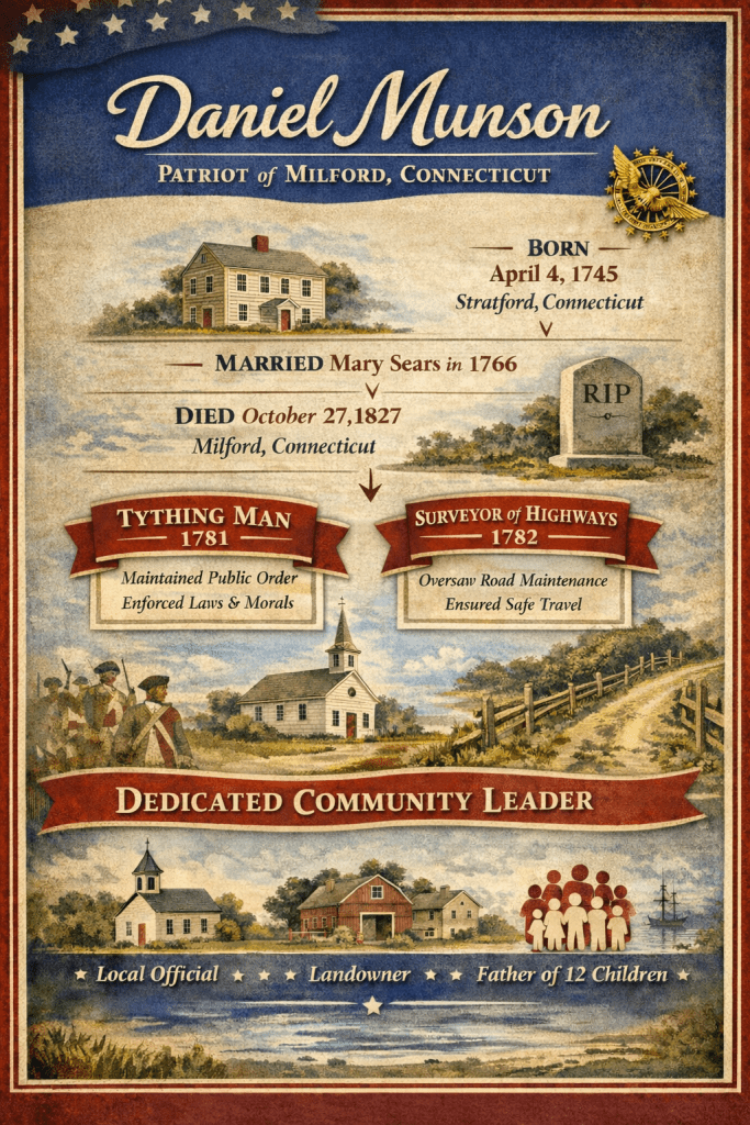 When we think of patriotic service during the American Revolution, it is easy to picture soldiers on the battlefield. Yet independence was secured just as surely by men who stayed home and kept their communities functioning during uncertain and dangerous times. One such patriot was Daniel Munson of Milford, Connecticut.