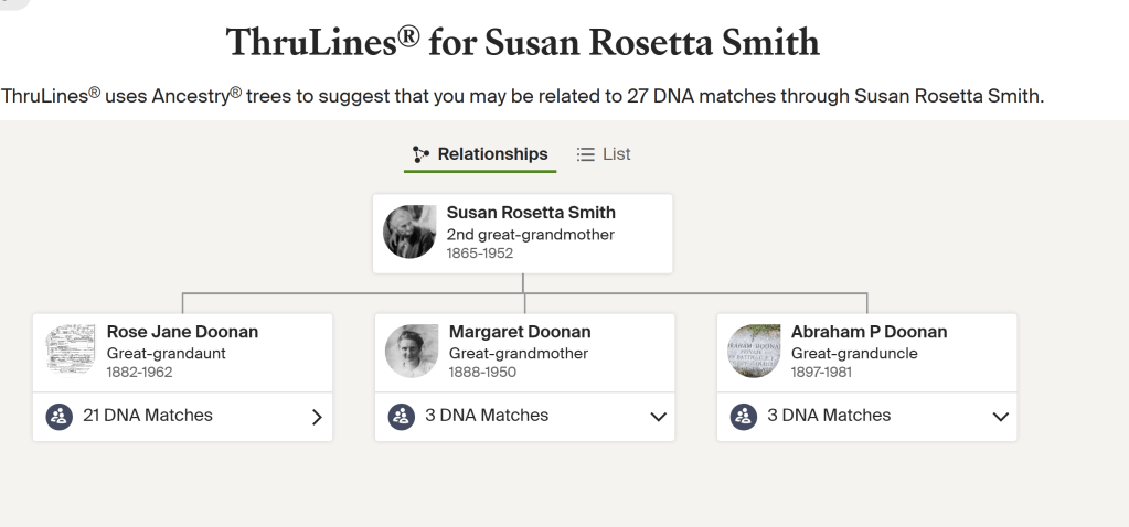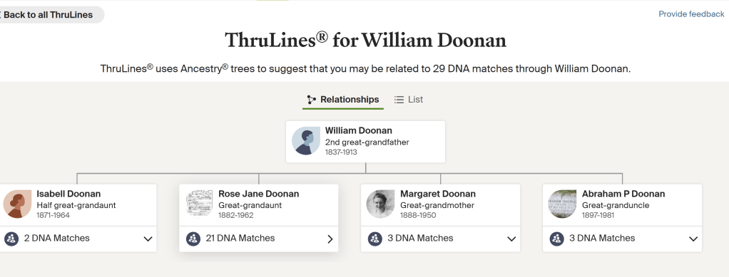 - AncestryDNA autosomal matches through multiple independent descendant lines of Rosa Jane Doonan.