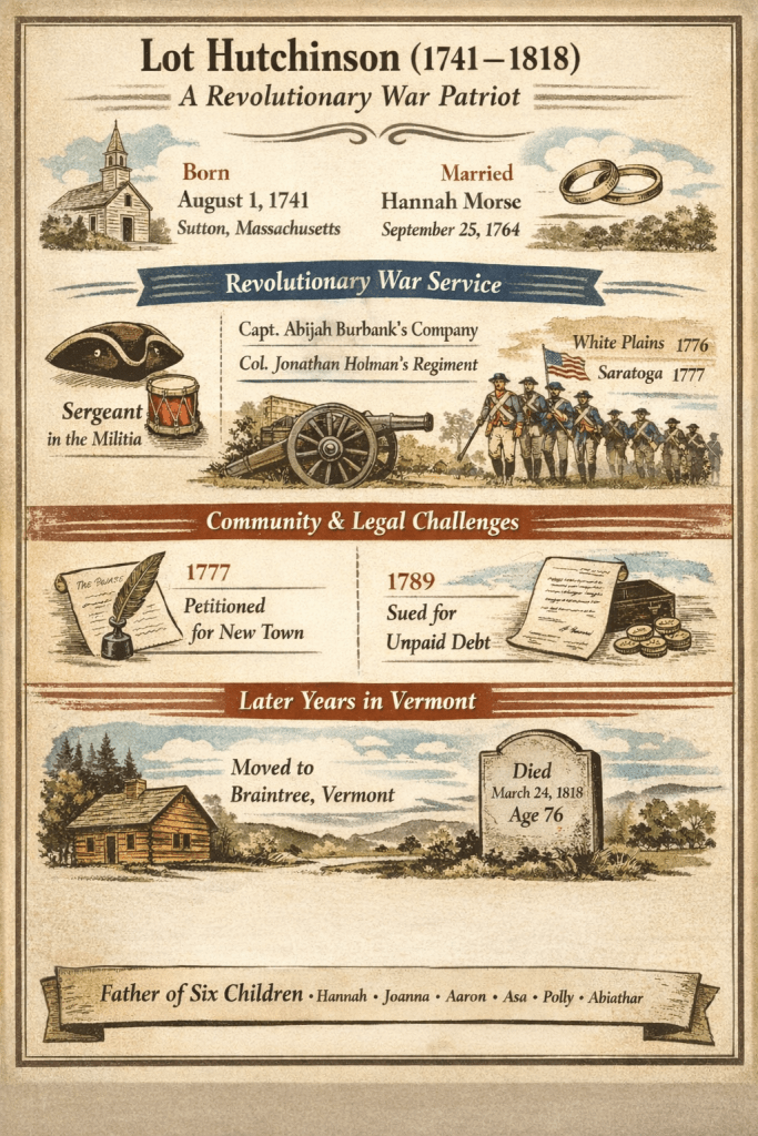 The 1810 census page for Braintree is significant for another reason: the Hutchinson family appears on the same enumeration, near Josiah Willington’s household. The households of Lot Hutchinson and Abiathar Hutchinson are recorded in the same sequence as Josiah’s.³ These are not random names. Lot Hutchinson is Polly’s father, and Abiathar Hutchinson is Polly’s brother.⁶