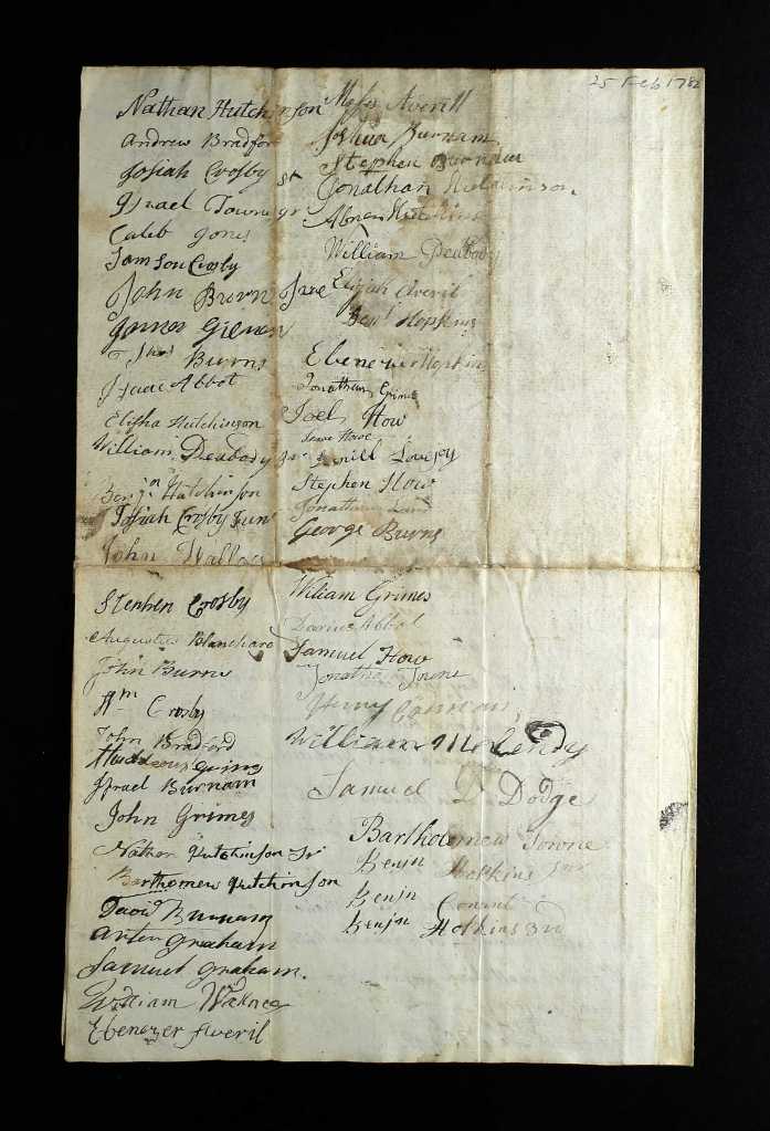 - Petition text and signatures, page 3, identifying Towne among Amherst inhabitants Bartholomew Towne on petition.