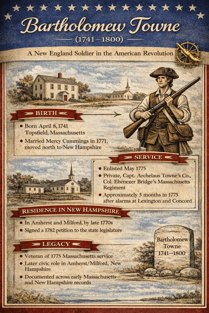 Bartholomew Towne’s Revolutionary War service is documented in both Massachusetts and New Hampshire records, placing him among the many New England men whose military and civic lives crossed colonial and early state boundaries. His service appears in compiled Massachusetts rolls from 1775 and later records from New Hampshire, reflecting the fluid movement of families and militia obligations during the war years.¹